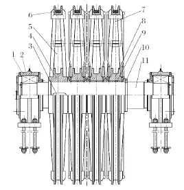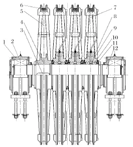 1. 軸承座 2. 主軸承 3. 鍵 4. 固定輪轂 5. 固定輪6. 襯墊 7. 游動輪 8. 游動輪轂 9. 軸套 10. 滾動軸承11. 輪轂端蓋 12. 天輪軸