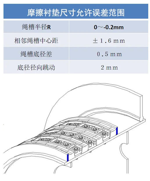 當磨損達到一個鋼絲繩直徑的深度,或沿側(cè)面磨損達鋼絲繩直徑一半時,或襯墊磨損后剩余厚度為鋼絲繩直徑的一半時,三種情況中有一種就應(yīng)更換襯墊。