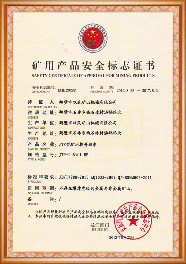 礦用產(chǎn)品安全標志證書